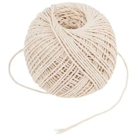 Изготовлен из хлопкового волокна методом скручивания нескольких волокон. Обладает высокой прочностью. Хлопковый шпагат мягкий, легко вяжется в узлы, устойчив к разрывам и растяжениям.