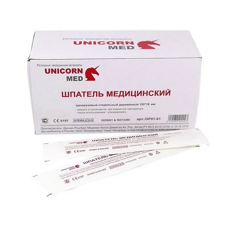 Медицинский шпатель Unicornmed прямой формы представляет собой стерильную плоскую палочку, используемую для осмотра ротовой полости при ларингологическом обследовании, целью которого является взятие соскоба для проведения гистологического анализа. При помощи шпателя происходит оттеснение языка и смещение тканей, благодаря чему обеспечивается нормальная видимость глубинных участков полости рта. Помимо своего прямого назначения, медицинские шпатели могут также использоваться для смешивания порошков и жидкостей, нанесения мазей и бальзамов. Деревянные шпатели безопасны, доступны и просты в применении. Каждый шпатель имеет индивидуальную упаковку. Стерильный. Одноразовый. Размер изделия: 150x18x1,8 мм. Количество в упаковке: 100 штук. Количество в транспортном коробе: 50 упаковок.