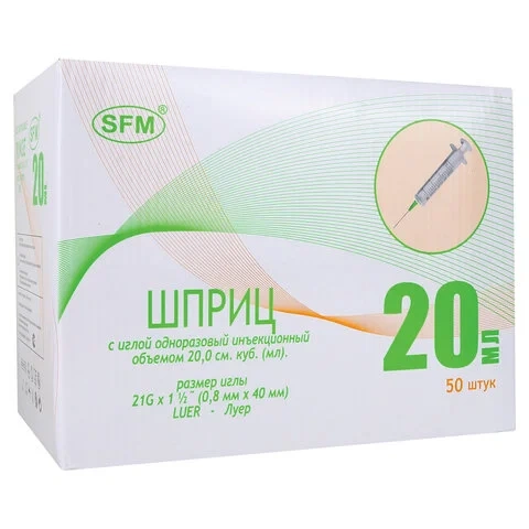Шприцы одноразовые Sfm 2-х компонентные 20мл, игла 0,8х40 - 21G, 50шт, коробка