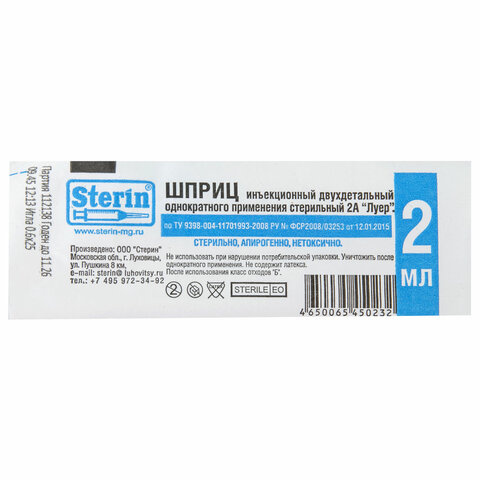 Шприцы одноразовые Стерин 2-х компонентные 2мл, игла 0,8х40 - 21G, 100шт, пакет