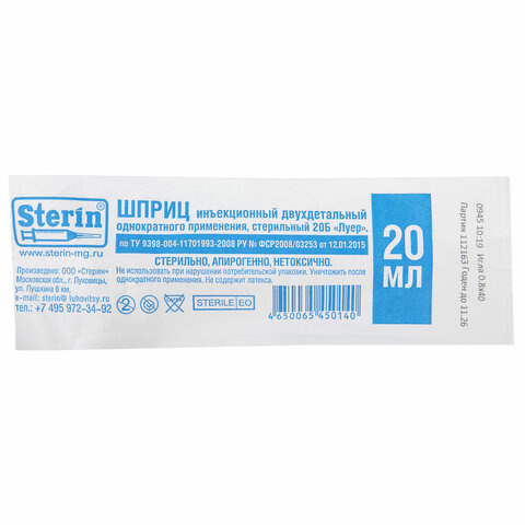 Шприцы одноразовые Стерин 2-х компонентные 20мл, игла 0,8х40 - 21G, 50шт, пакет