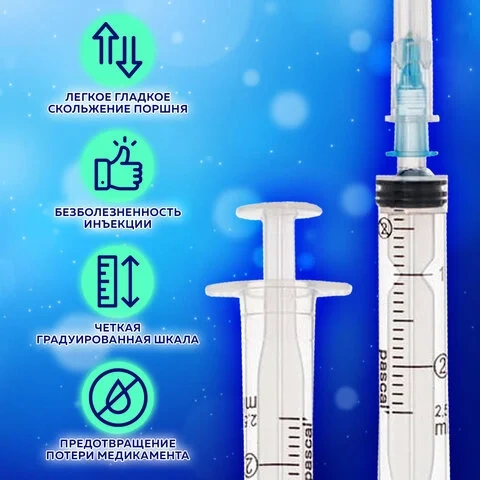 Шприцы одноразовые Pascal 3-х компонентные 2мл, игла 0,6х30 - 23G, 10шт, коробка