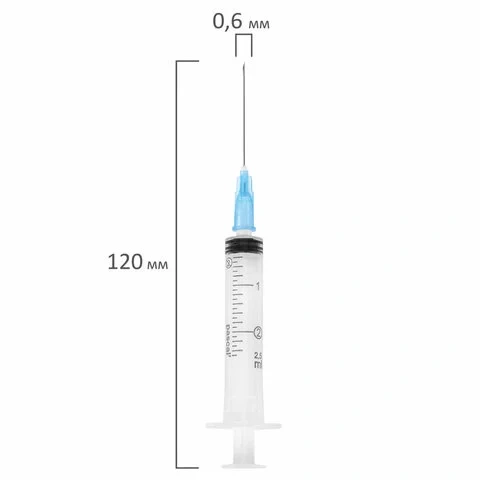 Шприц комплектуется одной надетой на шприц иглой инъекционной со стандартным срезом, с трехгранной заточкой и силиконовым покрытием для атравматического введения и снижения болезненности при проникновении в ткани.