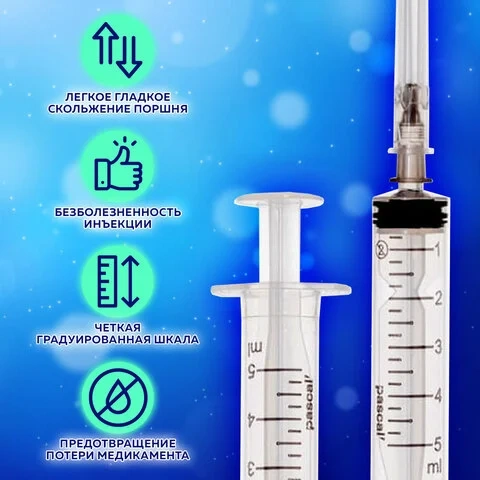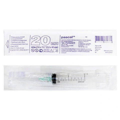 Шприцы одноразовые Pascal 3-х компонентные 20мл, игла 0,8х40 - 21G, 5шт, коробка