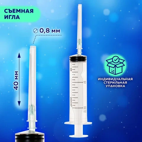 Шприц комплектуется одной надетой на шприц иглой инъекционной со стандартным срезом, с трехгранной заточкой и силиконовым покрытием для атравматического введения и снижения болезненности при проникновении в ткани. Цветовая кодировка иглы соответствует требованиям стандарта ГОСТ Р ИСО 6009. Материал канюли иглы — нержавеющая сталь. Предохранительный колпачок иглы имеет пять ребер жесткости, обеспечивающие удобство снятия, и, соответственно, дополнительную безопасность медицинского персонала при снятии колпачка с иглы и уменьшает риск контаминации иглы при снятии колпачка, а также обеспечивает экономию времени для выполнения простой медицинской манипуляции «инъекция».