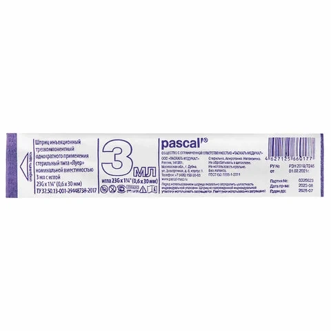 Шприцы одноразовые Pascal 3-х компонентные 3мл, игла 0,6х30 - 23G, 100шт, пакет
