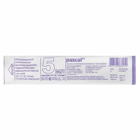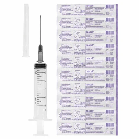 Шприцы одноразовые Pascal 3-х компонентные 5мл, игла 0,7х30 - 22G, 100шт, пакет