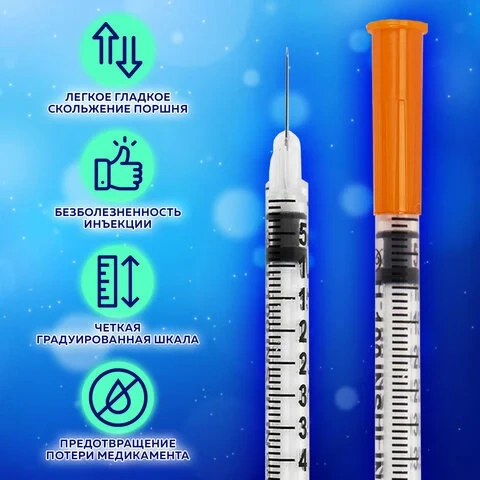 Безболезненность инъекции обуславливается легким скольжением поршня, без трения. Удерживающее кольцо на поршне предотвращает потерю медикамента. Градуировка на шприце выполнена в единицах инсулина и позволяет легко считывать показания.