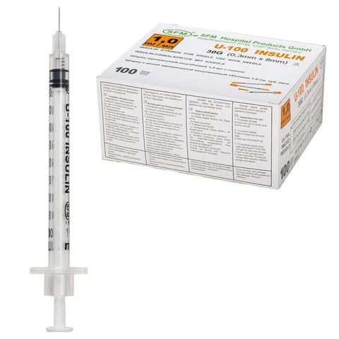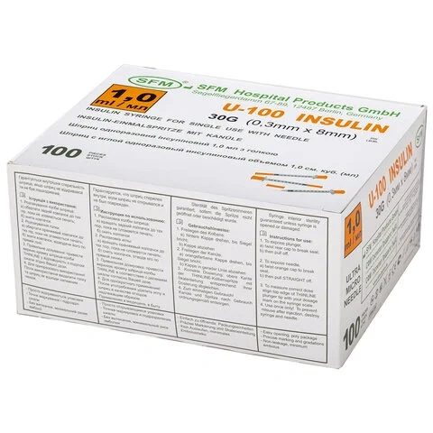 Шприцы одноразовые Sfm инсулиновые 1мл, U-100 игла несъемная 0,3х8 мм - 30G, 10шт, пакет