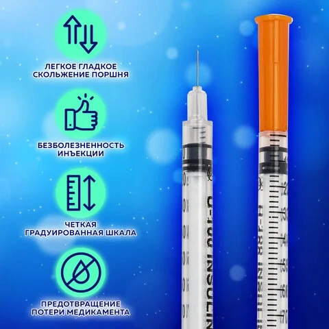 Безболезненность инъекции обуславливается легким скольжением поршня, без трения. Удерживающее кольцо на поршне предотвращает потерю медикамента. Градуировка на шприце выполнена в единицах инсулина и позволяет легко считывать показания.