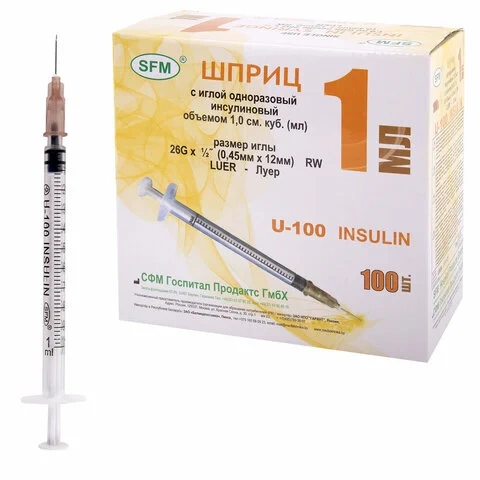 Шприцы одноразовые Sfm инсулиновые 1мл, U-100 игла 0,45х12 мм - 26G, 100шт, коробка