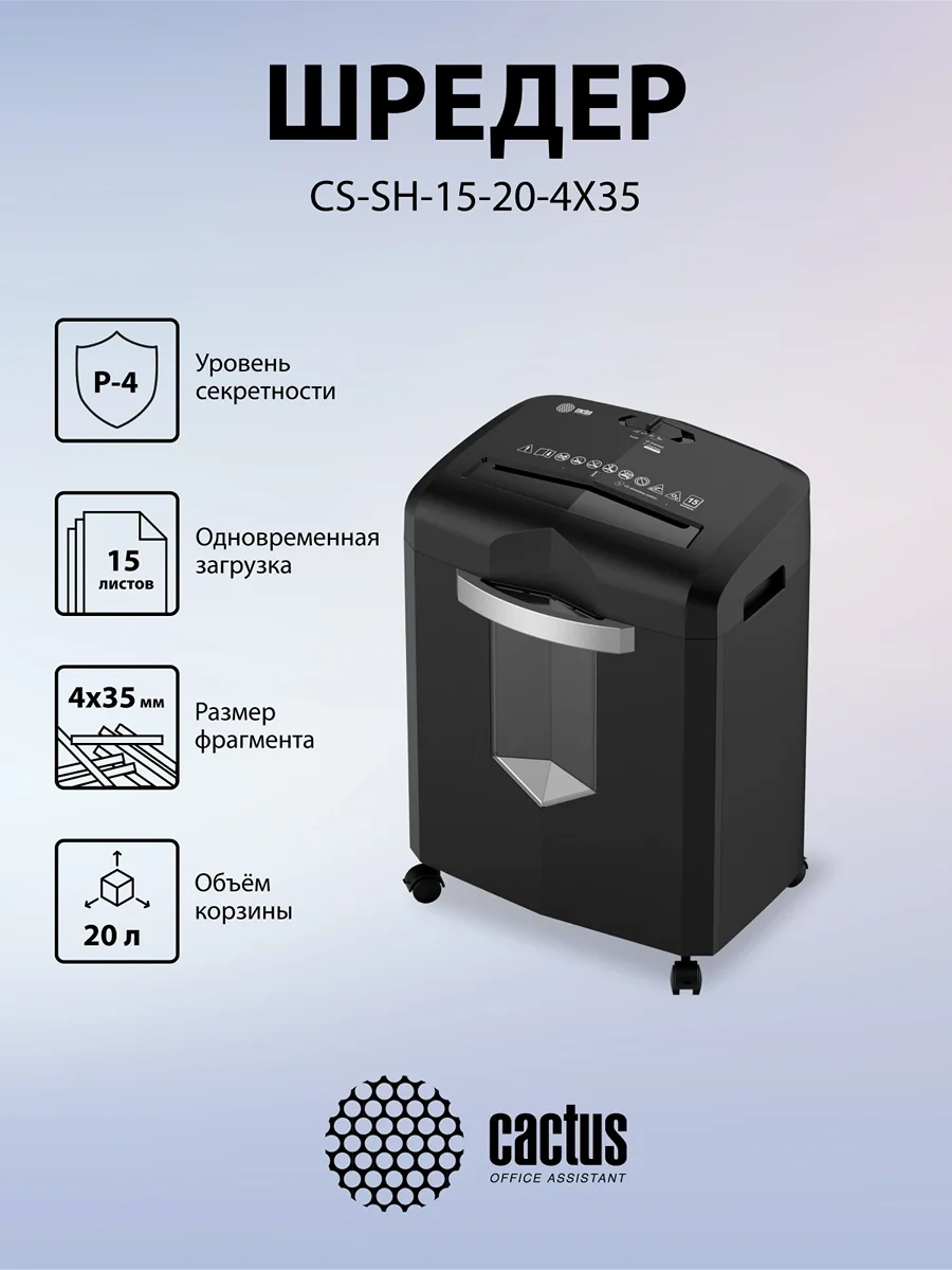Шредер Cactus CS-SH-15-20-4X35 (секр.P-4) фрагменты 15лист. 20лтр. скрепки скобы пл.карты CD