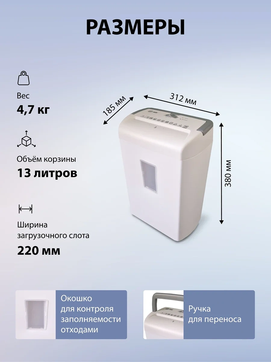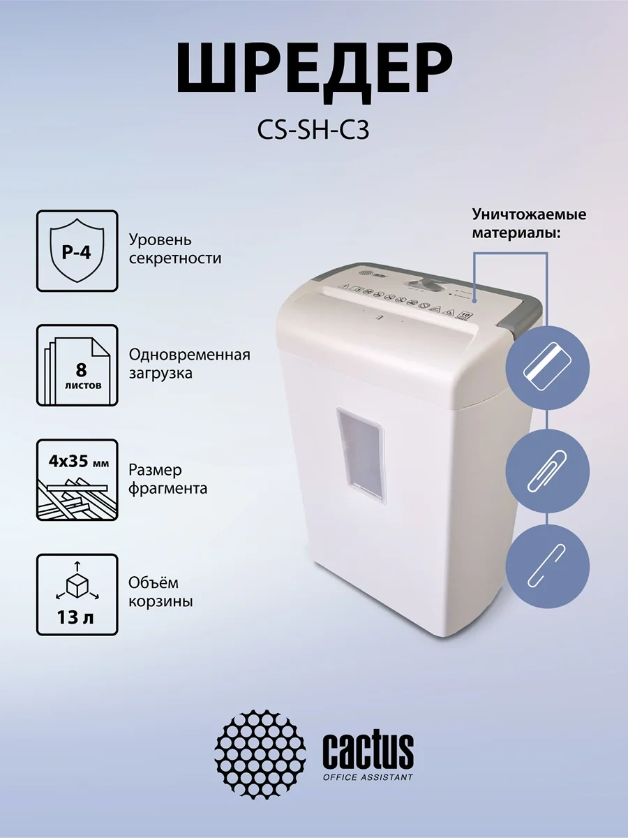 Шредер Cactus CS-SH-C3 белый (секр.P-4) фрагменты 8лист. 13лтр. скрепки скобы пл.карты