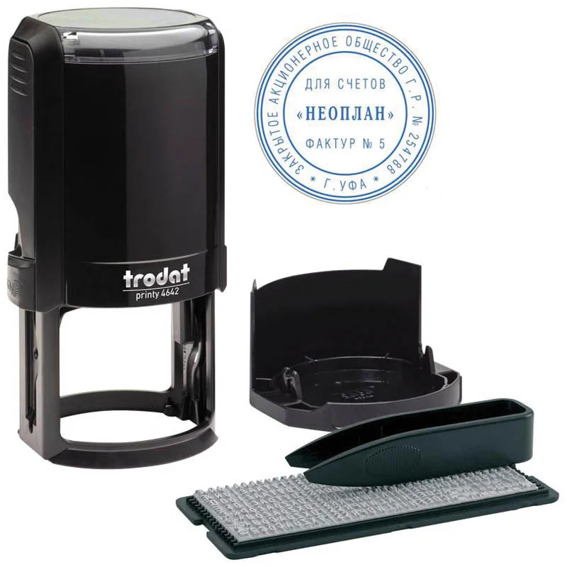 Самонаборная печать 1 круг. Наличие крышки позволяет переносить печать в сложенном виде. Интуитивно простая смена подушки, при которой пальцы всегда останутся чистыми. Долговечность, благодаря металлической втулке.