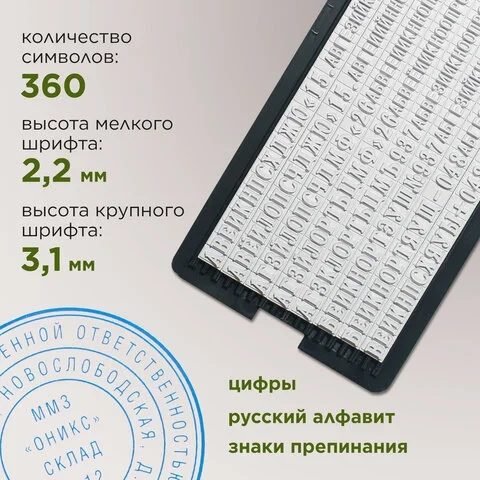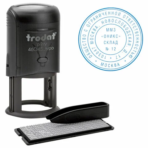 Самонаборная автоматическая печать. В комплекте автоматическая оснастка с рифленой пластиной, касса букв, цифр и символов (6005), пинцет, сменная подушка. Диаметр печати - 45 мм, 2 круга.