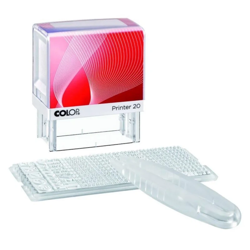 — Универсальная касса, А содержит на 33.3% больше букв, цифр и символов, чем у других производителей! Комплектация Colop Printer 20-Set: — компактная и надежная пластиковая оснастка с автоматическим окрашиванием и рифленой пластиной 14×38 мм для набора 4 строк текста; — универсальная касса букв Type Set A (арт. 621847);