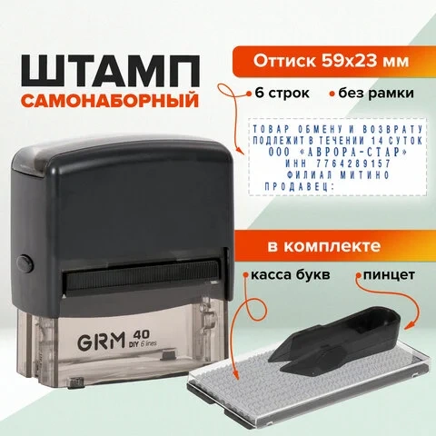 Штамп самонаборный 6-строчный, оттиск 59х23 мм синий, без рамки, GRM 40, КАССА В КОМПЛЕКТЕ, 11600004