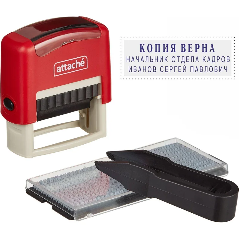 Штамп самонаборный Attache предназначен для самостоятельного создания и изменения текста оттиска. Компактный и надежный пластиковый корпус с автоматическим поворотным окрашивающим механизмом. На корпусе расположено информационное окно для корпоративной или личной персонализации. Легкая и чистая замена штемпельной подушки. Оптимальный набор букв, цифр и символов на двух ножках. Размер поля — 38×14 мм, 3 строки. Комплектация: штамп с рифленой пластиной для набора; одна касса букв: русские буквы, цифры, символы, 3 мм х 360 знаков, синяя сменная штемпельная подушка, пинцет. Внимание! При использовании широких символов (Ж, М, Ф, Ш, Щ, Ю, Ы), цифр, пробелов для набора текста данные по максимальной вместимости символов будут снижаться. Также символы рекомендуется размещать с отступом от края (внутрь) в случае использования разных шрифтов.