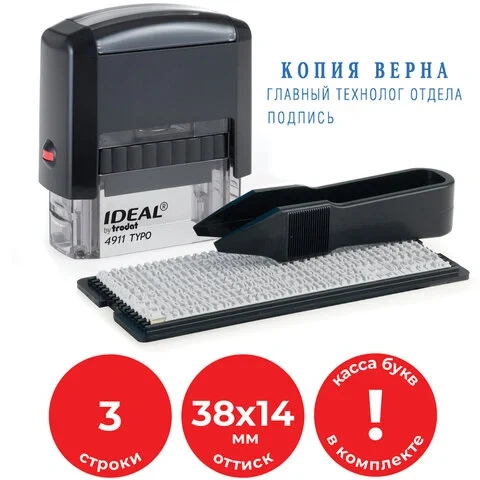 Штамп самонаборный Ideal, 3стр., 1 касса, пластик, 38*14мм, блистер (168224)