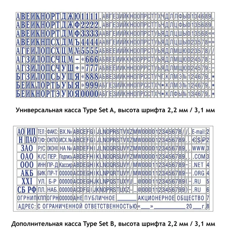 — Символы крепятся прочно и оперативно в пазы рифленой пластины, количество которых равно количеству строк;- Универсальная касса, А содержит на 33.3% больше букв, цифр и символов, чем у других штампов;