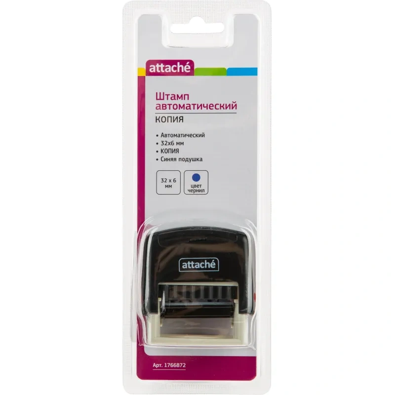Штамп стандартный Attache для проставления оттиска «КОПИЯ». Компактный и надежный пластиковый корпус с автоматическим поворотным окрашивающим механизмом. Легкая и чистая замена штемпельной подушки. Размер оттиска — 32×6 мм.