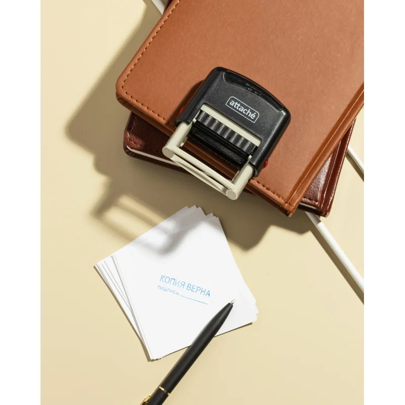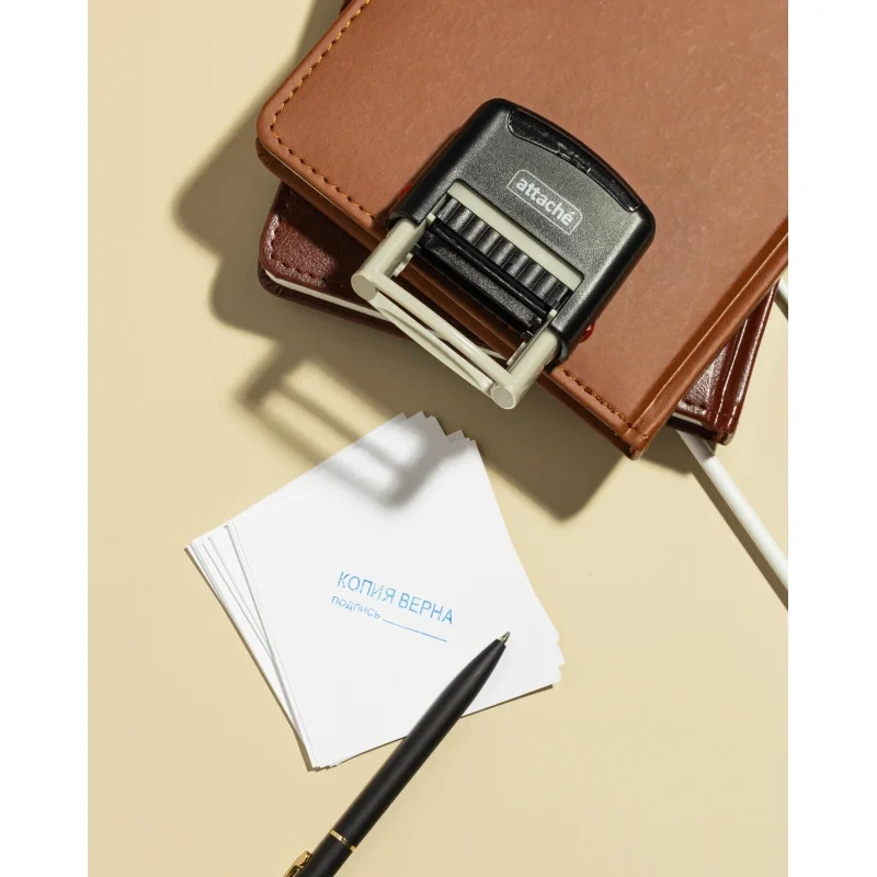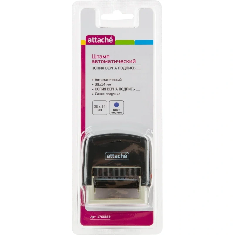 Штамп стандартный Attache КОПИЯ ВЕРНА подпись ______ 38х14 9011-T Штамп Attache стандартный для проставления оттиска 'КОПИЯ ВЕРНА подпись ___________'. Компактный и надежный пластиковый корпус с автоматическим поворотным окрашивающим механизмом. Легкая и чистая замена штемпельной подушки. Размер оттиска - 38x14 мм.