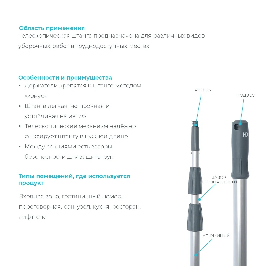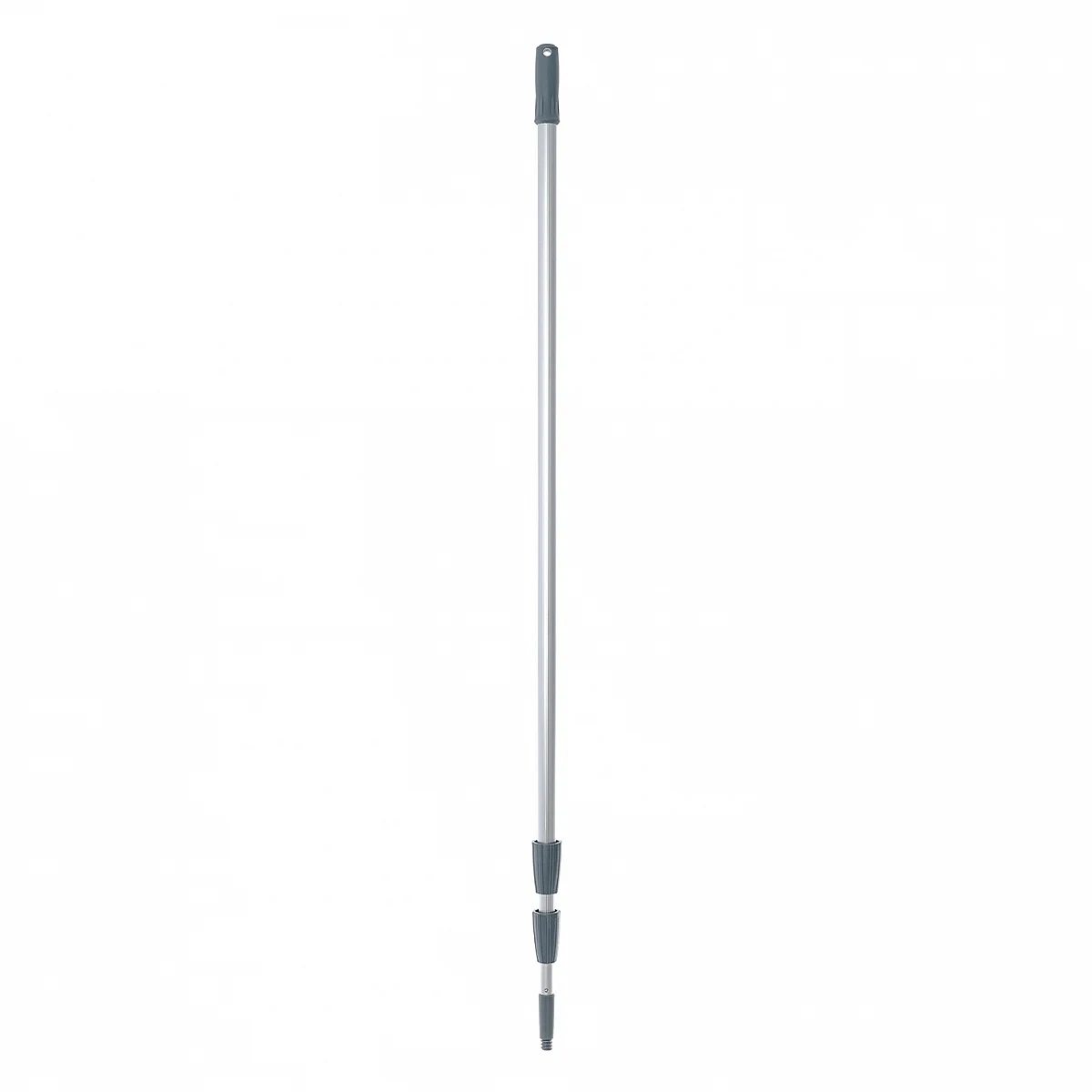 Штанга телескопическая предназначена для комфортного мытья окон. Изделие состоит из трёх колен, каждое длиной 1.25 метра, что позволяет увеличить общую длину до четырёх метров. Выполнена из алюминия и полипропилена. Телескопический механизм надёжно фиксирует штангу в выбранной длине, делая её пригодной для выполнения различных уборочных работ, включая работу на высоте. Штанга оснащена эргономичным захватом с противоскользящим покрытием, что облегчает управление инструментом при мытье стен и потолков. Возможность изменения длины рукоятки и наличие удобного захвата помогают снизить нагрузку на спину и руки, уменьшая усталость специалиста по уборке. Конструкция штанги отличается высокой прочностью на изгиб.