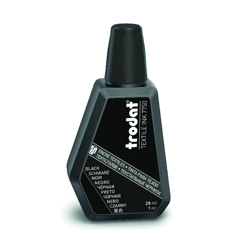 Краска для ткани Trodat 7750, черная. Подходит для всех текстовых клише с резиной для лазерной гравировки, а также для самонаборных штампов. Подходит для работы со всеми подушечными материалами. Не содержит опасных веществ. Наносится непосредственно на ткань. Успешно прошла дерматологическое испытание (в институте Dermatest, Германия) с общей оценкой «Отлично». Подходит для различных тканей, таких как хлопок, лен, полиэстер, смешанная ткань с вискозными волокнами, смешанная ткань с полиэстером. Выдерживает многократные стирки при температуре до 95C без потери качества оттиска. Устойчива к большинству сухих чистящих средств, применяемых в ходе химчистки. Подушки не высыхают в течение года при обычной комнатной температуре в жилых и рабочих помещениях (21,5 C и относительная влажность 40 % «умеренный климат».