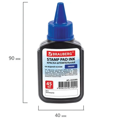 Оттиск штампа можно наносить на все виды бумаги, кроме глянцевой. Высококачественные чернила синего цвета на водной основе. Время высыхания оттиска - 30 секунд. Удобный пластиковый флакон с дозатором. Объем - 45 мл.