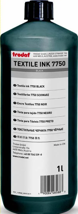 Краска для ткани Trodat 7750, черная. Подходит для всех текстовых клише с резиной для лазерной гравировки, а также для самонаборных штампов. Подходит для работы со всеми подушечными материалами. Не содержит опасных веществ. Наносится непосредственно на ткань. Успешно прошла дерматологическое испытание (в институте Dermatest, Германия) с общей оценкой «Отлично». Подходит для различных тканей, таких как хлопок, лен, полиэстер, смешанная ткань с вискозными волокнами, смешанная ткань с полиэстером. Выдерживает многократные стирки при температуре до 95C без потери качества оттиска. Устойчива к большинству сухих чистящих средств, применяемых в ходе химчистки. Подушки не высыхают в течение года при обычной комнатной температуре в жилых и рабочих помещениях (21,5 C и относительная влажность 40 % «умеренный климат».
