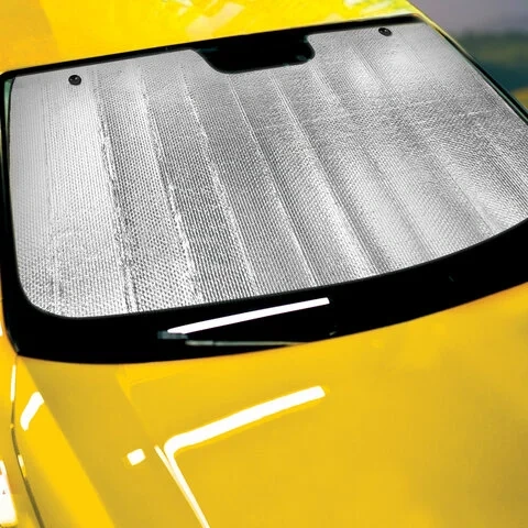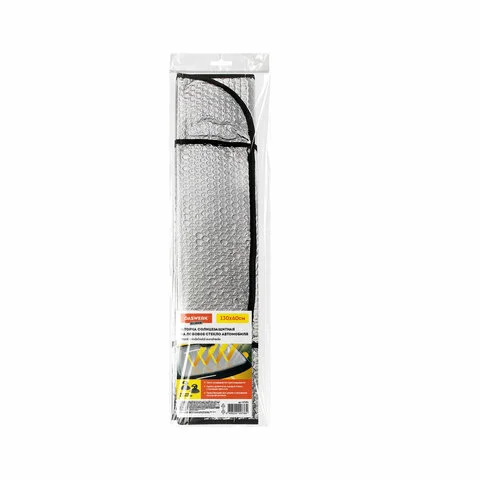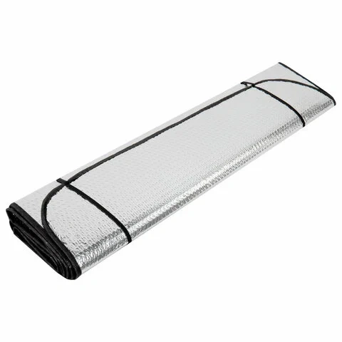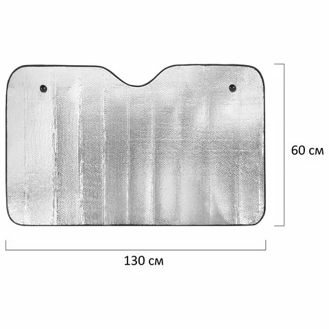 Серебристая поверхность шторки отражает солнечные лучи, препятствует нагреванию салона, защищает салон и торпеду от выгорания. Крепится на лобовое стекло автомобиля с помощью двух присосок. Размеры: ширина – 130 см, высота – 60 см.