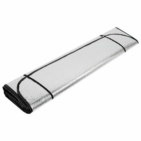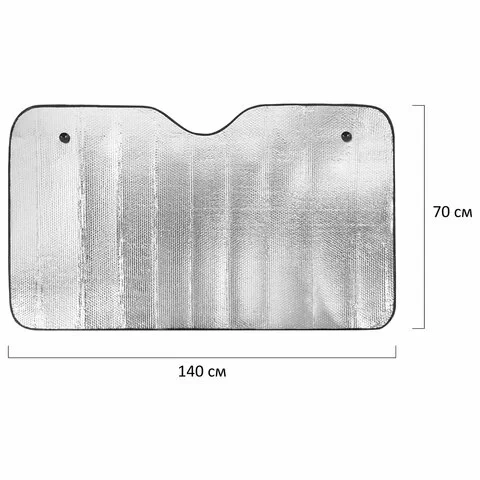 Серебристая поверхность шторки отражает солнечные лучи, препятствует нагреванию салона, защищает салон и торпеду от выгорания. Крепится на лобовое стекло автомобиля с помощью двух присосок. Размеры: ширина – 140 см, высота – 70 см.