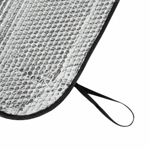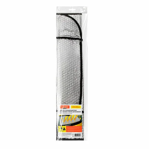 Серебристая поверхность шторки отражает солнечные лучи, препятствует нагреванию салона, защищает салон и торпеду от выгорания. Крепится на лобовое стекло автомобиля с помощью двух присосок. Размеры: ширина – 150 см, высота – 80 см.