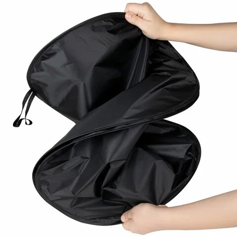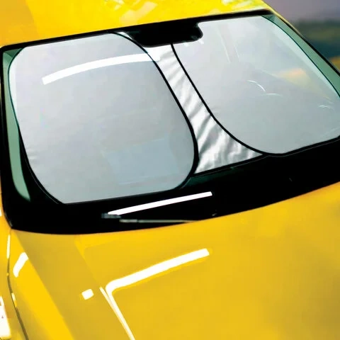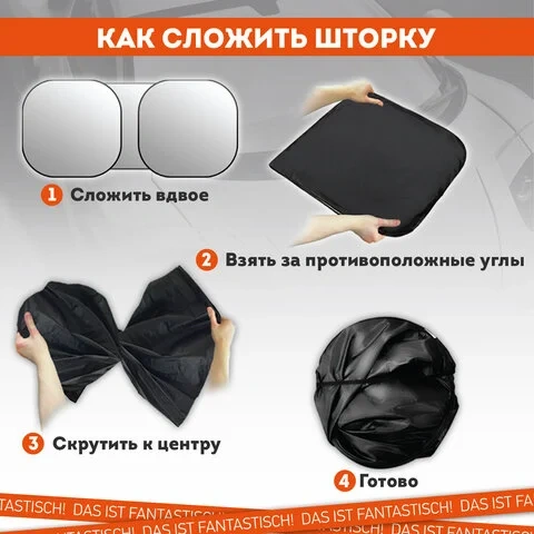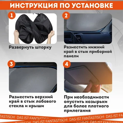 Чтобы установить солнцезащитную шторку, необходимо ее полностью развернуть, нижнюю часть закрепить на панели, а верхнюю часть прижать козырьками. Благодаря упругому каркасу по периметру шторка надежно фиксируется на лобовом стекле автомобиля и не сползает.