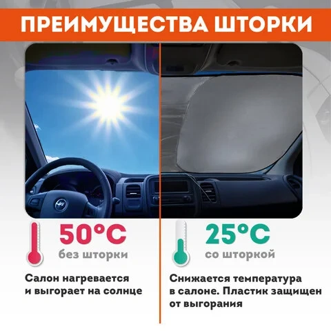 Серебристая поверхность шторки отражает солнечные лучи, препятствует нагреванию салона, защищает его от выгорания.