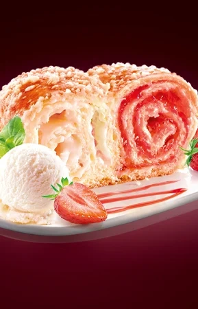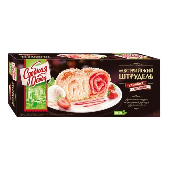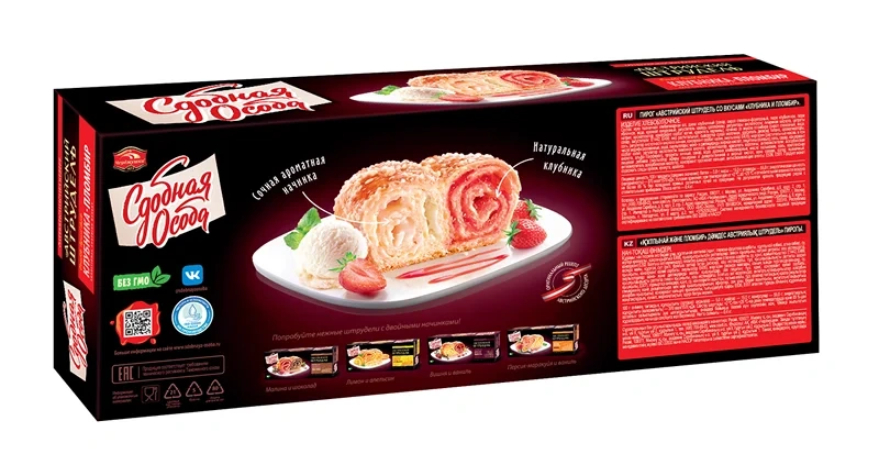 В тонких слоях Австрийского штруделя Сдобная особа сочетаются две начинки: клубничная и со вкусом пломбира. Оригинальная закрутка штруделя сохраняет его нежным и мягким.