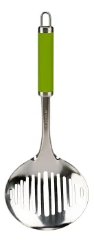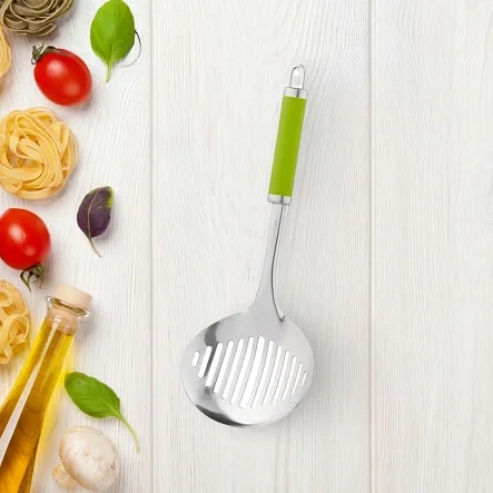 Шумовка Attribute Lime, 32 см — удобное и практичное решение для повседневного использования. Шумовка изготовлена из высококачественной нержавеющей стали. Функциональная форма позволяет легко почерпнуть содержимое. Особая конструкция отверстий быстро и эффективно сливают жидкость. Эргономичная ручка с покрытием soft-touch не нагревается и оснащена кольцом для практичного хранения на кухне. Аксессуар обладает устойчивостью к коррозии и сохраняет привлекательный внешний вид даже при многократном использовании. Легко моется и не впитывает запахи продуктов. Шумовка прекрасно справляется с различными задачами. Она идеально подходит для переливания супов, соусов и других жидкостей. Благодаря своей компактности и удобной форме, она легко справляется с подъемом пищи из глубоких кастрюль и сковородок.