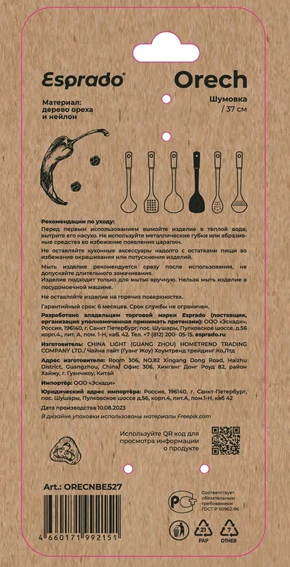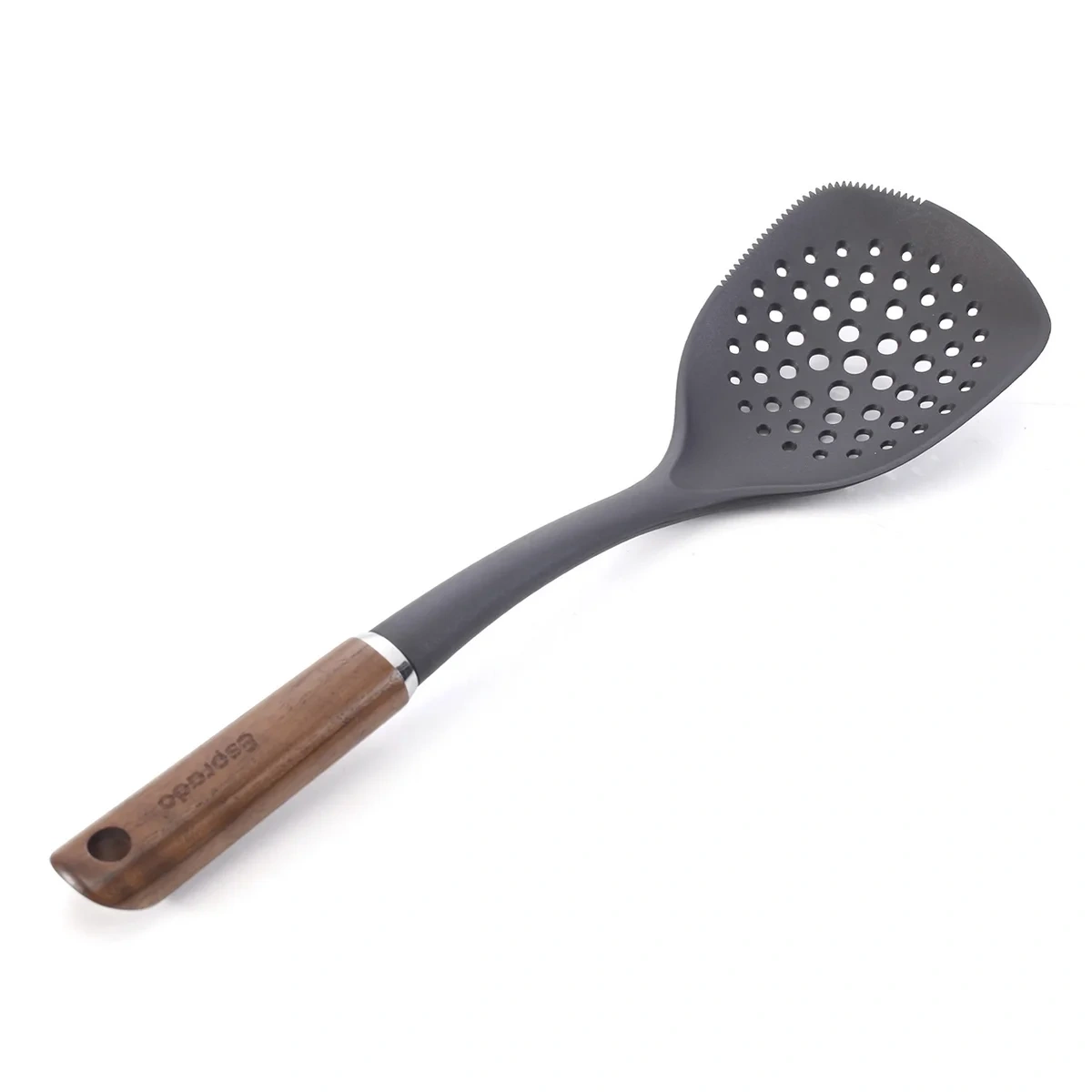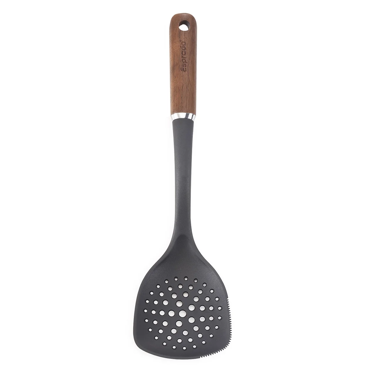 Шумовка из коллекции аксессуаров “Orech” - стильный и незаменимый помощник на вашей кухне. Дизайн сочетающий в себе ручку из натуральной древесины ореха и нейлон чёрного цвета прекрасно впишется в интерьер любой кухни. Грецкий орех обладает антимикробными свойствами, предотвращая рост патогенных бактерий. Качественный нейлон выдерживает нагрев до 200C исключая плавление аксессуара и появление запаха жжёного пластика на горячих поверхностях. Шумовка не впитывает посторонние запахи и легко моется. Рабочая поверхность шумовки, выполненная из нейлона не царапает посуду. Коллекция аксессуаров “Orech” не содержит вредный бисфенол А. Шумовка экологична и безопасна для человека и окружающей среды. В коллекцию так же входят: половник, половник со сливом, ложка с прорезями, плоская лопатка и с прорезями. Собрать дома функциональную и эксклюзивную коллекцию аксессуаров с ручкой из натурального орехового дерева ни составит для вас труда.
