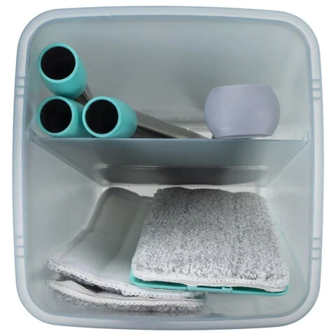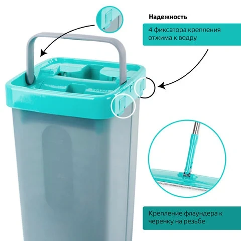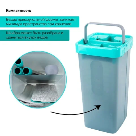Набор состоит из прямоугольного ведра с двумя отсеками (первый отсек с чистой водой, второй отсек с туннельным отжимом для отжима МОПа и сбора мусора / грязной воды). Отжим МОПа происходит посредством плотного прижатия флаундера в корпусе туннельного отжима. Для удобства хранения швабру можно разобрать на части и аккуратно сложить все элементы в ведро (см. фото).