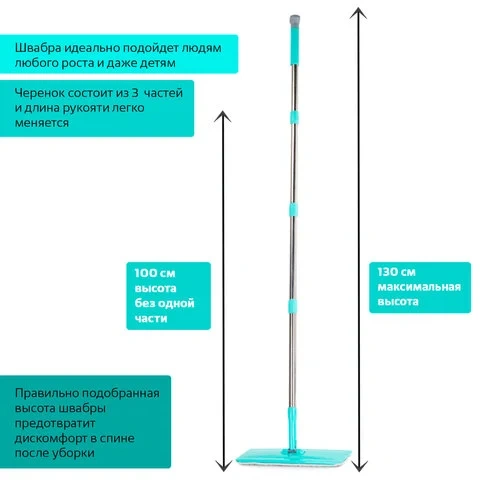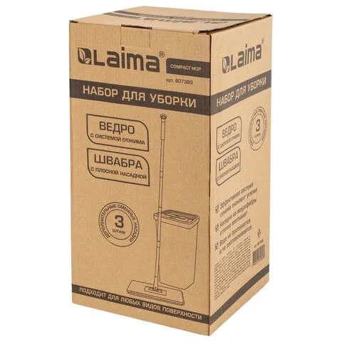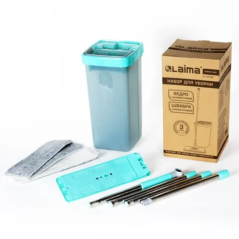 Данный набор для уборки уникален своей компактностью и при этом очень функционален. Уникальность данного набора для уборки состоит и в том, что за счет трех составных частей черенка он становится универсальным: максимальная длина черенка равна 130 см, но если убрать одну часть, то длина становится 100 см. В комплекте идут 3 сменные насадки, которых хватит на долгое время использования. Также их можно применять для уборки разных комнат. Одна из двух частей ведра имеет мерные деления 3,0-4,5 литра с ценой деления 0,5 литра.