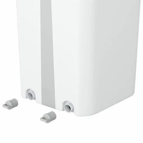 Ведро объемом 12 литров, при этом полезный объем ведра 9 литров. Разделено на два отсека для чистой и грязной воды: один для мытья – позволяет вымыть швабру, не дотрагиваясь до нее руками, второй – для вертикального отжима швабры за несколько секунд. Оба отсека в нижней части ведра имеют сливные отверстия с резиновыми заглушками, которые надежно защищают ведро от проливания жидкости во время использования.