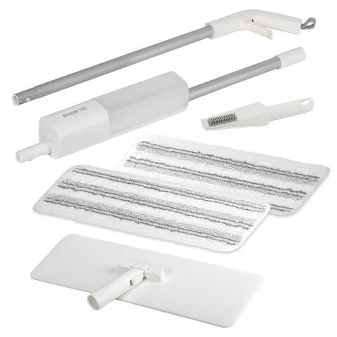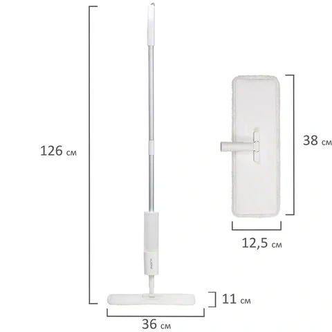 Рукоятка оснащена курком при нажатии на который происходит распыление жидкости. Эффективный механизм позволяет регулировать количество воды на полу и обеспечивает широкий угол распыления. Микрофибра удаляет загрязнения, оставляя после себя чистую и сухую поверхность.