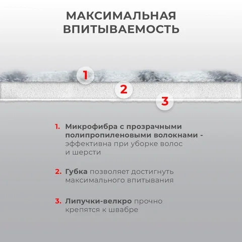 Губка между верхним и нижним слоями надёжно впитывает и удерживает влагу, забирая в структуру ткани любые загрязнения, и не оставляет разводов. Внешний слой с прозрачными полипропиленовыми волокнами очищает поверхность от мелкого мусора и пыли.