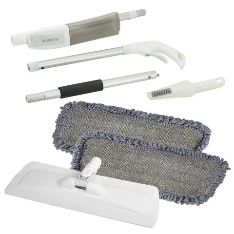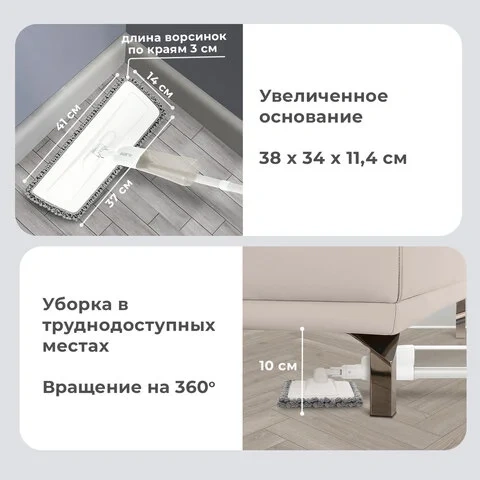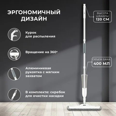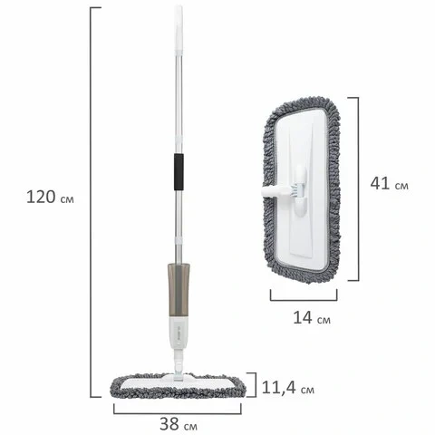 Рукоятка оснащена курком при нажатии на который происходит распыление жидкости. Эффективный механизм позволяет регулировать количество воды на полу и обеспечивает широкий угол распыления. Микрофибра удаляет загрязнения, оставляя после себя чистую и сухую поверхность.
