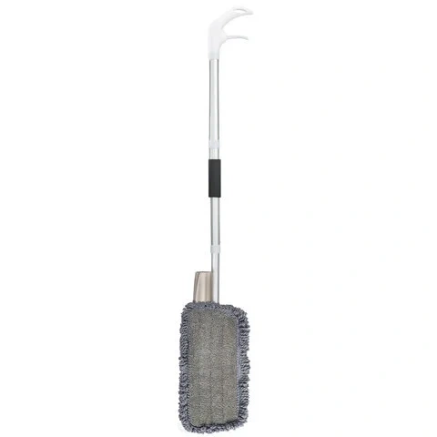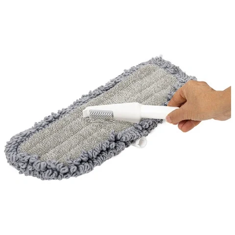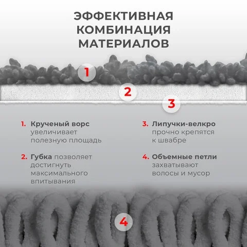 Губка между верхним и нижним слоями надежно впитывает и удерживает влагу, забирая в структуру ткани любые загрязнения, и не оставляет разводов. Внешний слой со скрученными нитями очищает поверхность от мелкого мусора и пыли. Крученые петли работают как деликатный абразив и усиливают впитывающие свойства микрофибры. Объемные петли по краям эффективны при уборке волос и шерсти. Для удобства хранения скребок для очистки микрофибры можно крепить на рукоятку швабры.