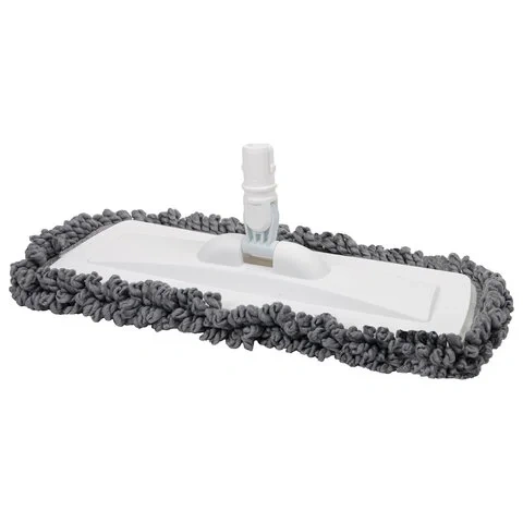 Основание швабры трапециевидной формы создано специально для уборки в углах. Снизу по периметру основания есть специальные пластиковые крючки, к которым быстро и надежно крепится насадка из микрофибры, оснащенная липучками.
