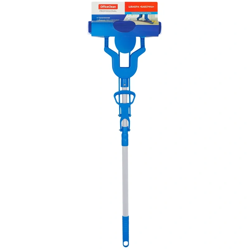 Швабра самоотжимная OfficeClean Professional с губчатой насадкой из износостойкого PVA (ПВА) предназначена для проведения влажной уборки полов, ковровых покрытий, а также для мытья окон и стен. Специальный механизм отжима 'Бабочка' позволяет избежать контакта рук с водой и моющими средствами. Процесс отжима швабры происходит за счет подъема ручки отжимного механизма, закрепленного на рукоятке швабры, он приводит в действие боковые части насадки, которые складываются пополам и сдавливают губку. С помощью механизма ручного отжима можно регулировать степень влажности насадки из PVA (ПВА).
