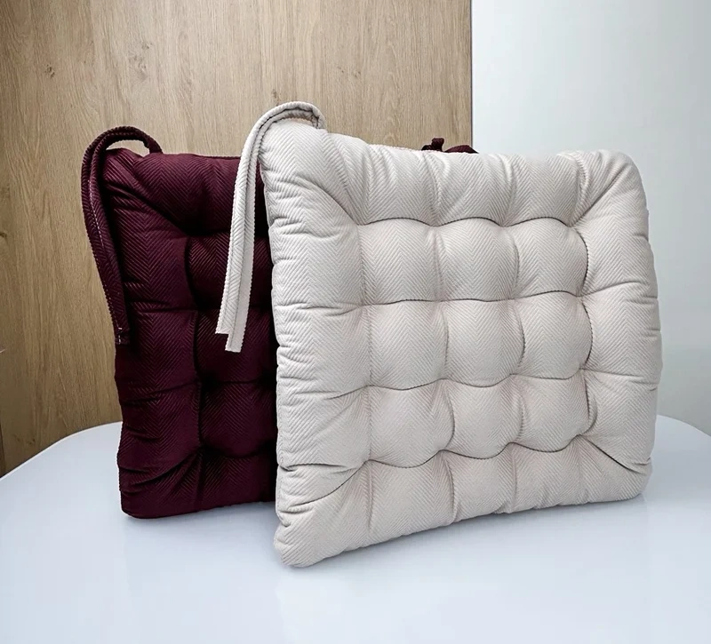 Сидушка-подушка для стула на завязках, с декоративным тафтингом, размером 38 см x 38 см. Выполнена из велюра с тиснением классическим узором елочка.