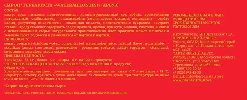 Сироп Herbarista Арбуз, 700мл