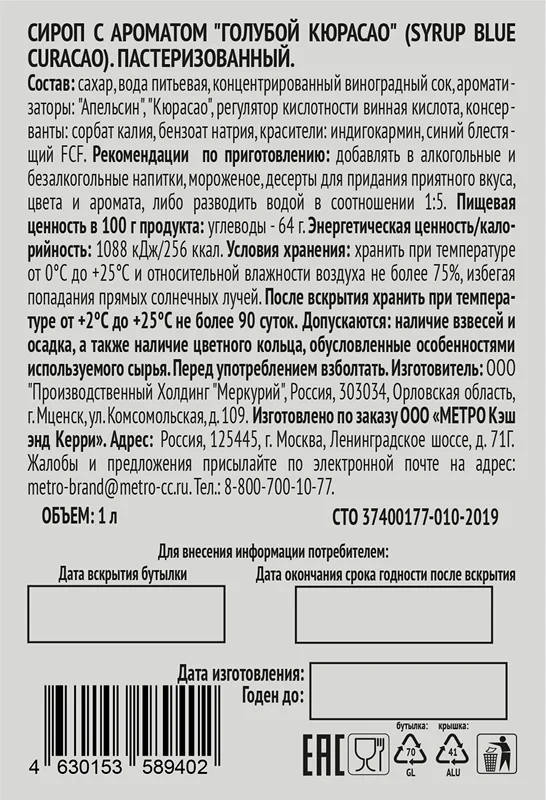 Сироп Блю Кюрасао приготовлен на основе отборных спелых апельсинов, которые выращиваются на острове. Во вкусе присутствует легкая горчинка, которая придает сладкому вкусу свою оригинальность. Именно такое необычное сочетание вкуса и оттенка делают его востребованным для приготовления всевозможных коктейлей и напитков. Часто его используют для коктейля Голубые Гавайи. Также он служит основой для приготовления лимонадов и миксов без алкоголя.